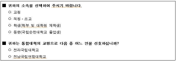 국립순천대학교와 국립목포대학교의 통합 추진과 관련하여, 통합대학 교명 선정을 위한 기초자료로 활용하고자 구성원 의견을 수렴하는 교명 선호도 조사를 다음과 같이 실시합니다.