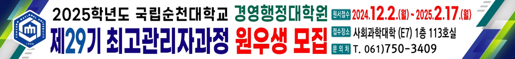 국립순천대학교 경영행정대학원 최고관리자과정은 지역사회 각계 각층 지도자의 관리능력 배양과 산학협력을 통해 지역 및 국가 발전에 기여할 목적으로 1995년 11월 15일 개설된 후 약 1,750여 명의 수료생을 배출하였습니다. 국립순천대학교 경영행정대학원 최고관리자과정은 지방자치단체, 공공기관 및 기업체 임직원, 각 직역별 대표 등을 대상으로 최신 이슈 중심의 전문지식과 경영관리능력 배양을 위한 특강 위주의 교육과정을 운영하고 있습니다. 2025학년도 제29기 경영행정대학원 최고관리자과정 신입생을 모집하고 있습니다. 글로컬대학 국립순천대학교의 지역-대학 발전에 발맞추어 지.산.학 협력의 매개체로 거듭나고자 합니다. 제29기 경영행정대학원 최고관리자과정 원우모집에 적극 협조하여 주시면 감사하겠습니다.