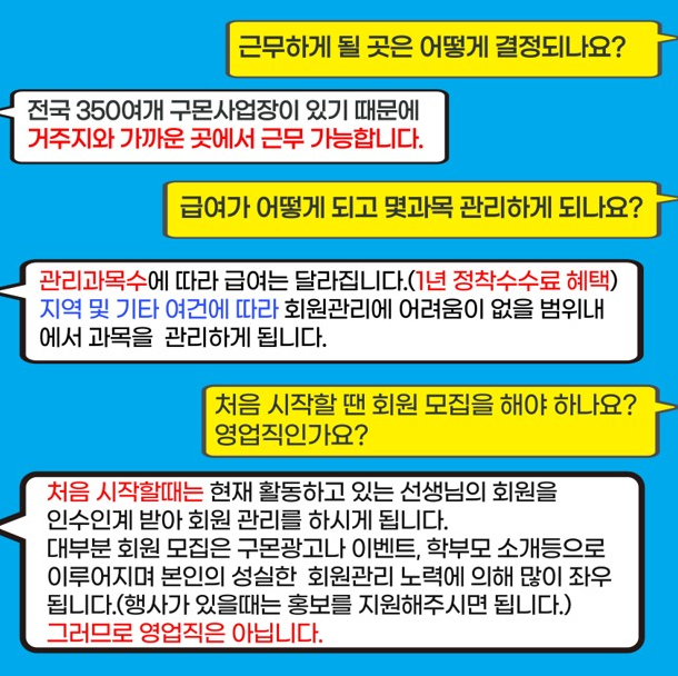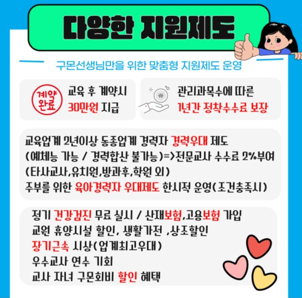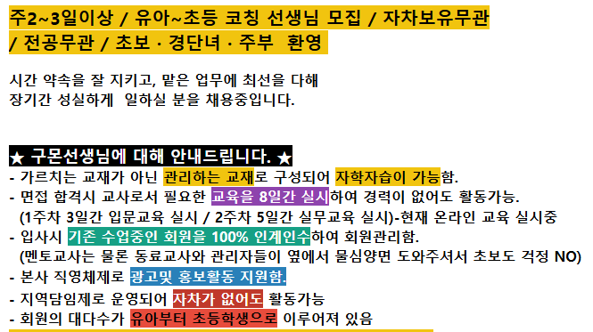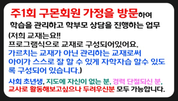 유아~초등관리 구몬교사 채용/주3~4일근무,개인시간 사용용이/초보가능,전공무관에 대한 상세정보