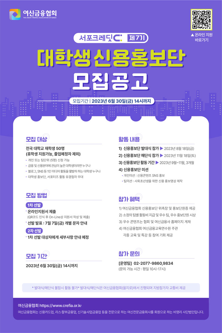 여신금융협회에서 대학생들이 알아두면 유용한 신용 관련 지식 및 정보들을 전파할 '제7기 서포크레딧 대학생 신용홍보단'을 모집합니다!
