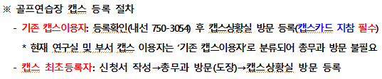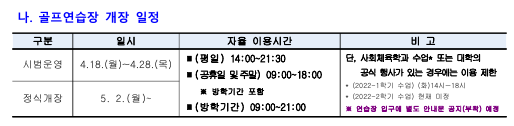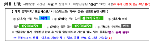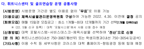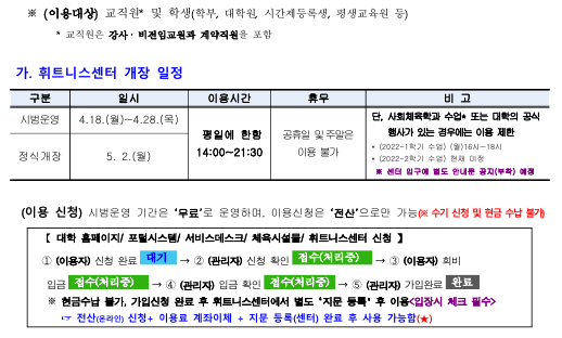 1. 학생 및 교직원의 복지를 증진하고 학내 체육시설물 운영을 활성화하기 위하여 휘트니스센터와 골프연습장을 붙임과 같이 개장하오니 많은 이용 바랍니다. 이용하고자 하시는 구성원께서는 붙임문서를 확인하여 주시면 감사하겠습니다. 2. 그리고, 시범운영 기간에는 '로커(사물함)'를 사용할 수 없음을 양해해 주시기 바랍니다.(단, 신발장 사용은 가능) 3. 골프연습장은 시범운영기간에도 포털시스템에서 신청 후 캡스 등록 이후 이용가능하오니, 확인 부탁드립니다