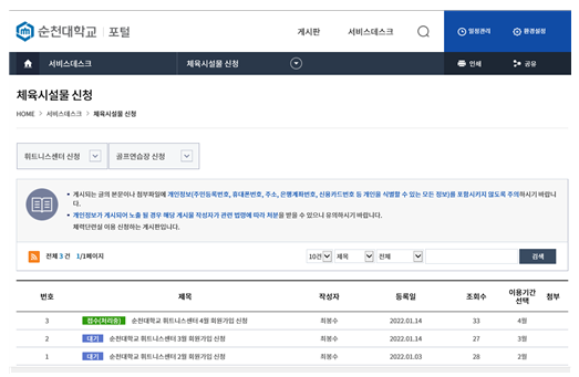 - 신청 배너(포털 접속>서비스데스크>체육시설물 신청)