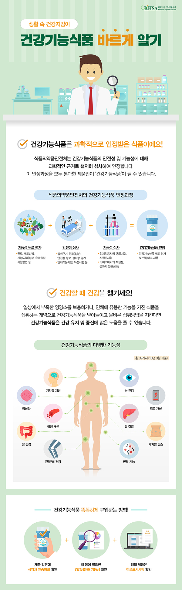 2. 섭취자에 필요한 기능성 선택하기 식품의약품안전처로부터 인정받은 건강기능식품의 기능성은 면역기능, 장 건강, 눈 건강, 체지방 감소, 피부 건강 등 총 32가지다(2018년 3월 기준). 이처럼 다양한 기능성 중에서 섭취자의 연령, 건강상태 등을 고려해 가장 적합한 제품을 선택해야 한다. 제품 뒷면에 표기된 ‘영양·기능정보’를 보면 기능성 성분을 비롯해 섭취량, 섭취방법 등을 확인할 수 있다. 만약 섭취자가 특정 질병을 갖고 있거나 복용 중인 약물이 있다면 전문가와 상담한 후 구매하는 것이 좋다.