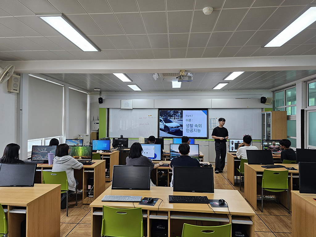 국립순천대학교 SW중심대학사업단에서는 SW교육 및 체험 프로그램을 통해 미래 SW인재 발굴 및 SW가치확산을 도모하고 SW 전공분야에 대한 이해와 관심을 키울 수 있는 기회 제공을 목적으로 AI·SW 가치확산 교육을 진행하고 있다. 2024 .8. 20.(화), 21.(수)에 고흥도화중학교 재학생 17명을 대상으로 "2024 AI·SW 가치확산 교육 프로그램"을 운영하였다. "인공지능과 생성형 AI 활용하기"라는 주제로 생활 속의 인공지능, 사진 인식, 사물 인식 실습, 포즈 인식 실습, 그림 그리기 실습 등 이론과 실습을 조화롭게 구성한 교육을 진행했다.